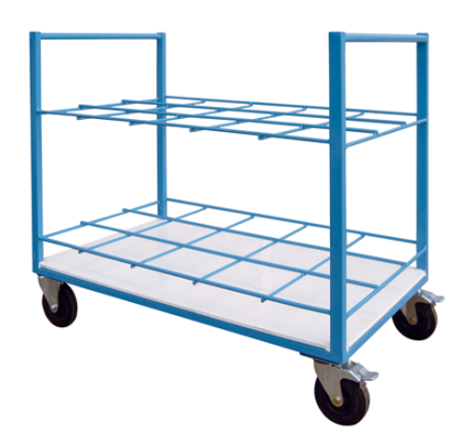 Er ist ausgestattet mit zwei Lenk/Brems- und zwei Bockrädern. Die Räder haben durch ihre Kunststoff-Felgen mit Vollgummibereifung kaum Rollwiderstand und garantieren trotz des Gewichts eine leichte Beweglichkeit des Wagens. Die Einzelradbelastung liegt bei 100 kg.