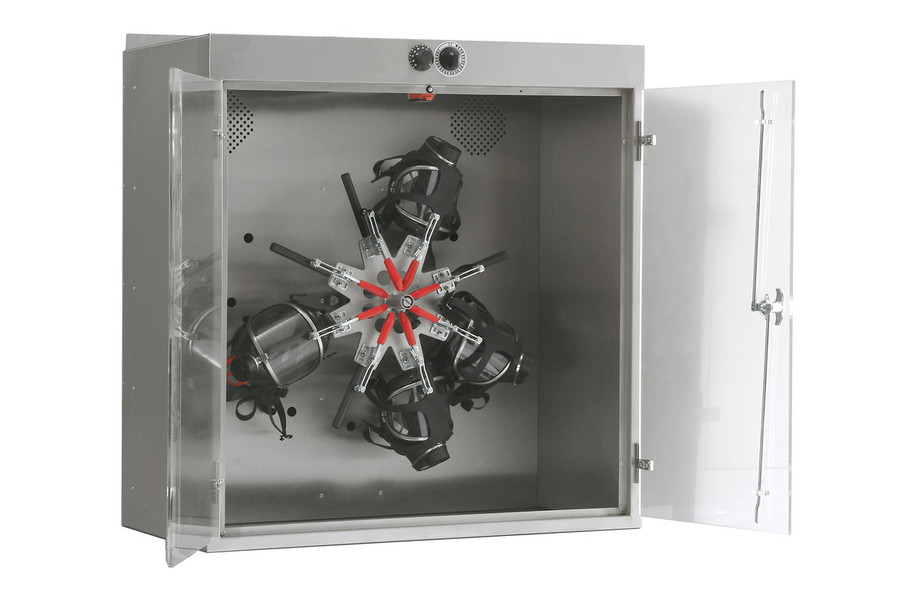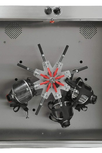 Gewährleistet eine effiziente und schonende Trocknung durch das ständige Drehen der Atemschutzmasken. Die Trockenzeit beträgt 15-30 Minuten. Leicht zu bedienende Zeitschaltuhr, Temperaturregelung durch Kapillarfühler, Platzsparend, auch Wandmontage möglich, Sicherheit durch sofortiges Ausschalten beim Öffnen der Türen, Material: INOX; Türen wahlweise aus Plexiglas oder INOX, schnelles und einfaches Klemmverfahren am Sichtglas, daher für alle Maskentypen geeignet.