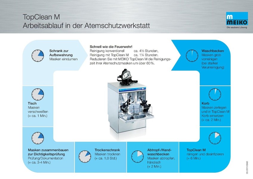 Mit dem MEIKO TopClean M gewährleisten Sie höchstmögliche Hygienesicherheit für die Atemschutzmaskenträger. Und dies bei geringsten Betriebskosten, kurzen Programmlaufzeiten und optimierten Arbeitsabläufen für die Gerätewarte.