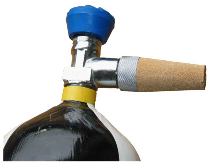 Der Schalldämpfer wird in das Flaschenventil eingeschraubt und danach das Ventil langsam geöffnet. Die in der Flasche gespeicherte Luft strömt nun unter stark reduzierter Geräuschentwicklung über den Schalldämpfer ab.