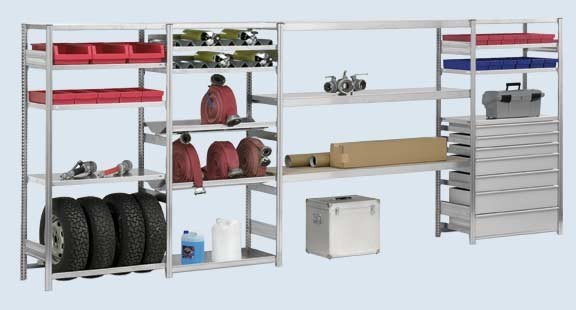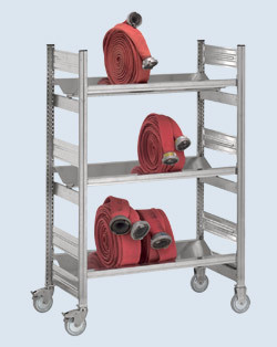 Feststehende Schlauchregale oder fahrbare Schlauchwagen ermöglichen eine knickfreie und fachgerechte Lagerung von Feuerwehrschläuchen. Die Auflageebenen sind speziell abgerundet und verfügen über eine Ablaufrinne für problemloses Ablaufen von Restwasser. Die fahrbaren Schlauchwagen erleichtern den Transport der Schläuche vom oder zum Einsatzwagen.